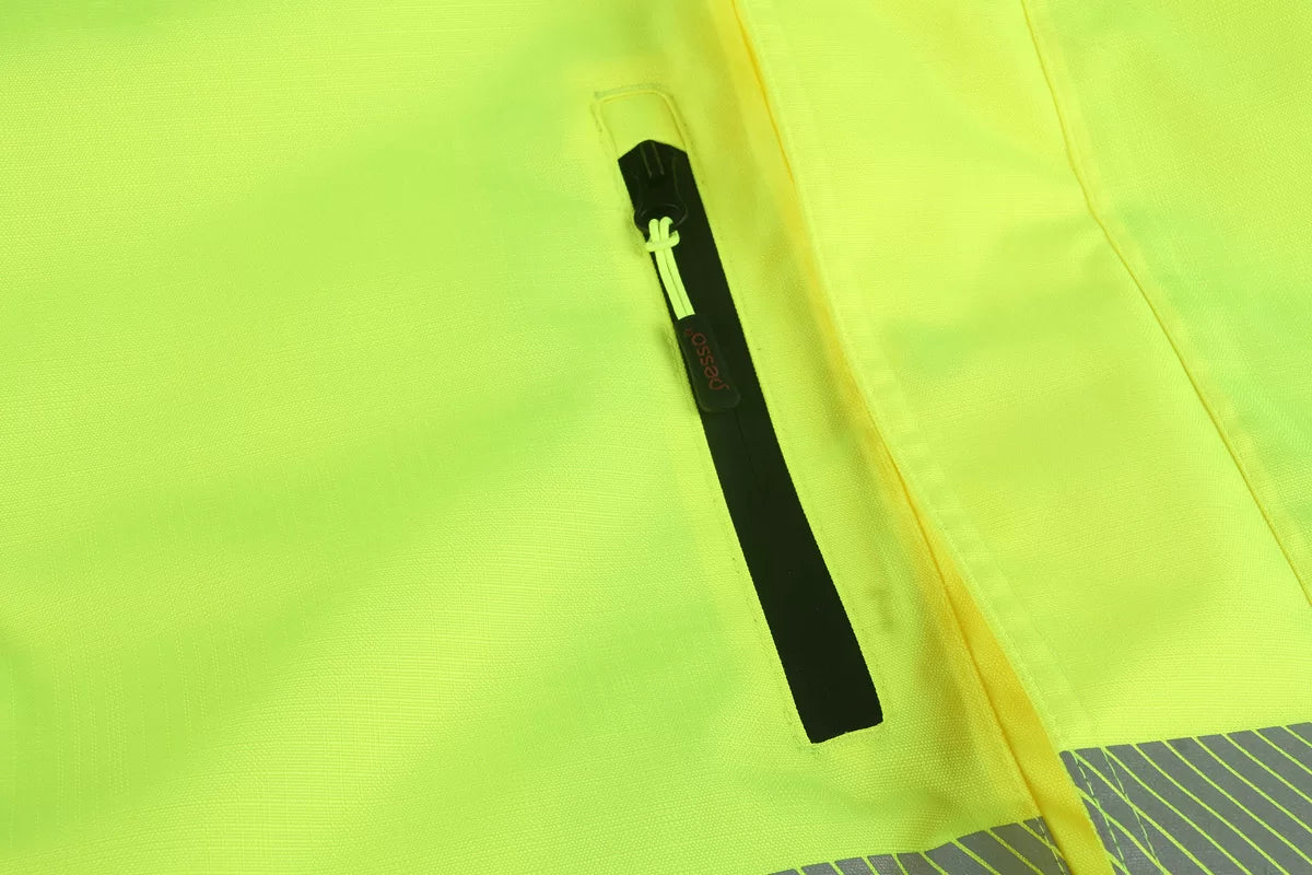 Windproof, waterproof, breathable, jacket with partly High Vis fabric and Reflective tapes in heavyweight PE/RIP-STOP  fabric coated PU material. The modern convenient model does not restrict freedom of movement. Double-stitched for extra durability.