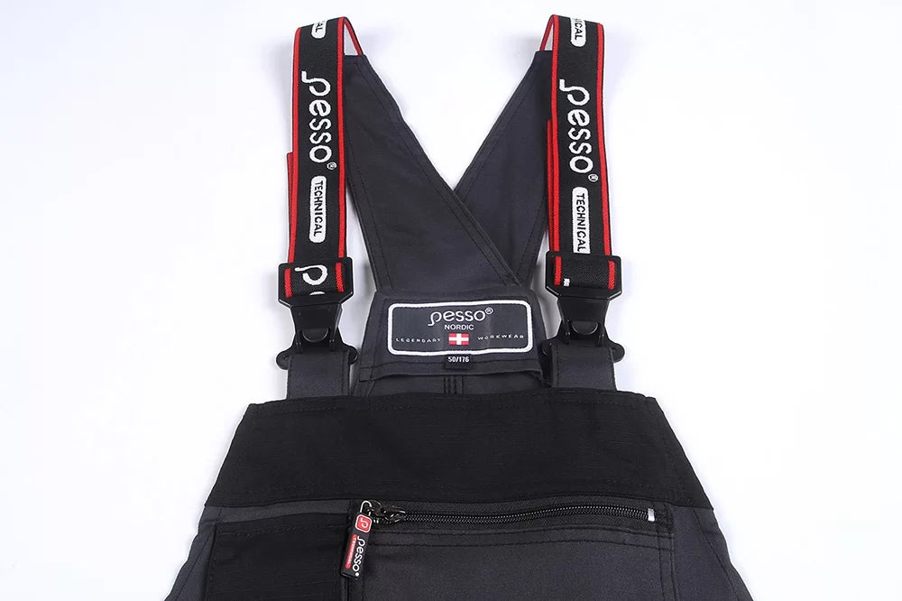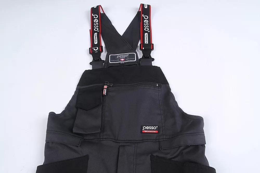 Pesso workwear bibpants from strong Cotton fabric TWILL STRETCH with elastane. Reinforcements with RIP-STOP material. Comfortable & Flexible.